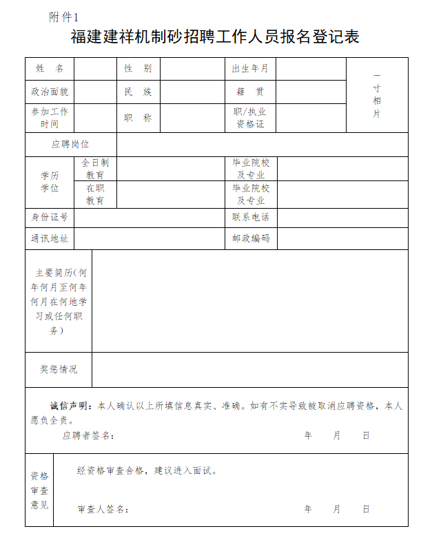附件1:福建建祥機(jī)制砂招聘工作人員報(bào)名登記表